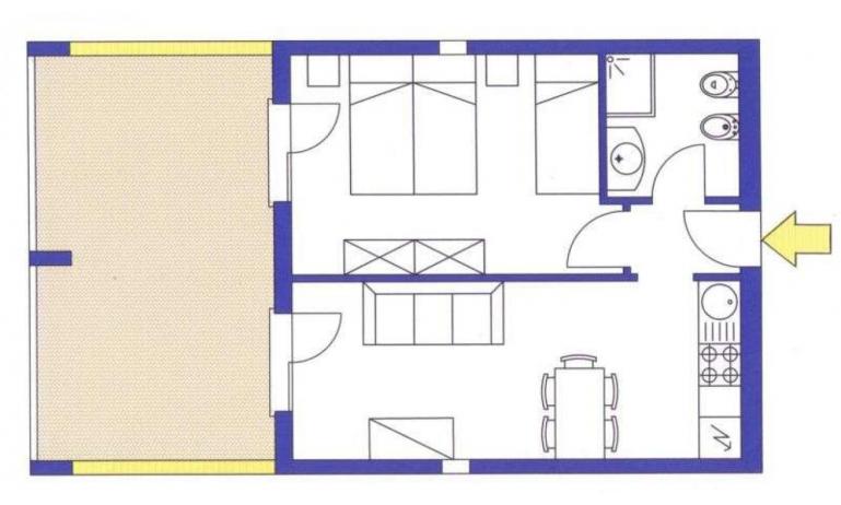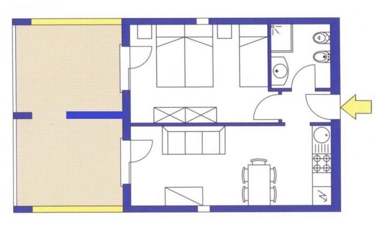A foot-path leads directly to the beach, where a parasol, a sun bed and a deck-chair are reserved for each apartment.
