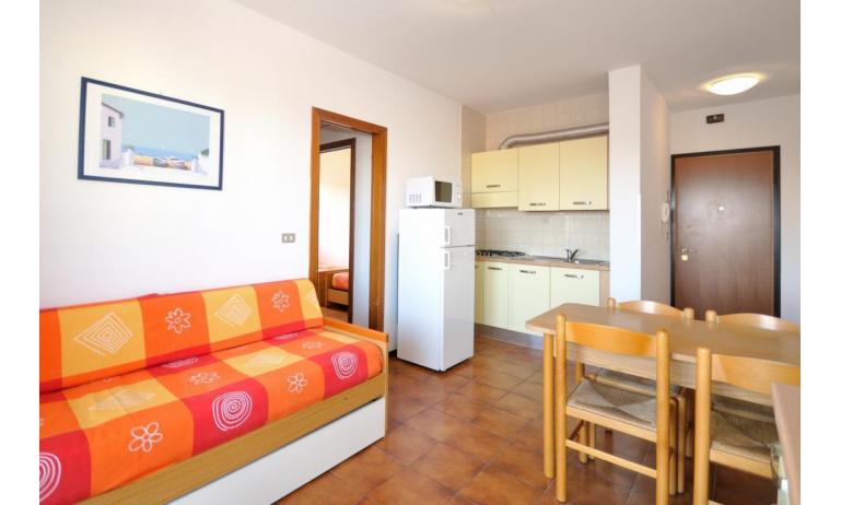 B5: salle à manger avec coin-cuisine et canapé-lit double, 1 chambre à coucher avec lit double + simple, salle de bain avec cabine de douche. Grand balcon meublé avec table et chaises. - max 5 personnes
