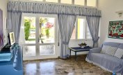C6: Maison de deux étages (environ 60 m²), avec un grand jardin clôturé, composée au rez-de-chaussée d'un salon lumineux, d'une cuisine séparée communicant avec l'extérieur, d'une chambre avec lit double et d'une terrasse extérieure aménagée pour manger en plein air.