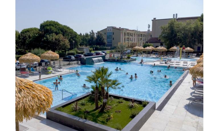 Die Ferienanlage Residence La Quercia in Caorle Altanea bietet einen großen Außenpool für Erwachsene und Kinder, mit Wasserspielen und einem stimmungsvollen Wasserfall. Der Solariumbereich ist mit Sonnenliegen und Sonnenschirmen ausgestattet – perfekt zum Entspannen unter der Sonne.