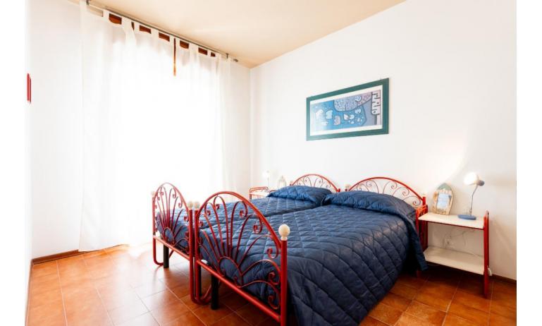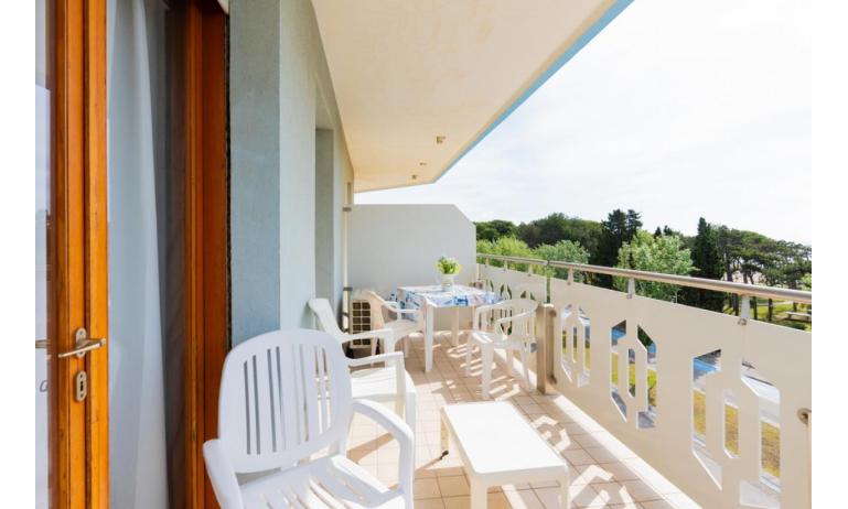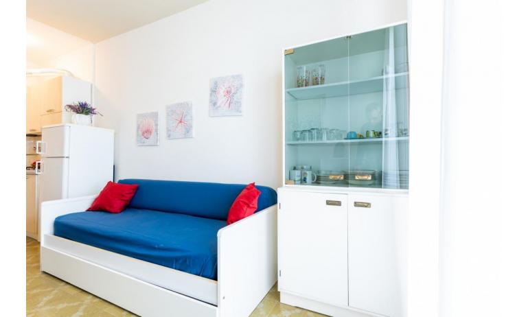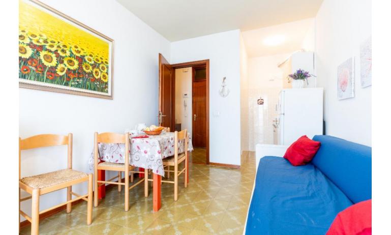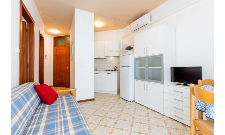 B4: Appartamento bilocale (circa 42 m²) composto da soggiorno con angolo cottura, divano letto doppio, camera con letto matrimoniale, bagno con doccia e balcone arredato con tavolino e sedie. Occupazione massima: 4 persone.